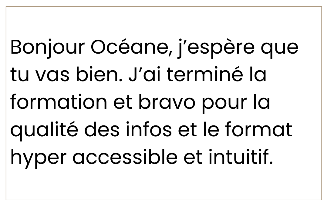 Cette formation n’est pas finançable par le CPF. Elle a été conçue pour rester volontairement simple et directe : un tarif juste, un accès immédiat, et une autonomie totale. C’est aussi ce choix qui permet de maintenir une grande flexibilité, sans compromis sur la qualité de l’accompagnement proposé. Le paiement en 4 fois sans frais est possible pour vous permettre de lisser le coût sans ajout de frais supplémentaires.